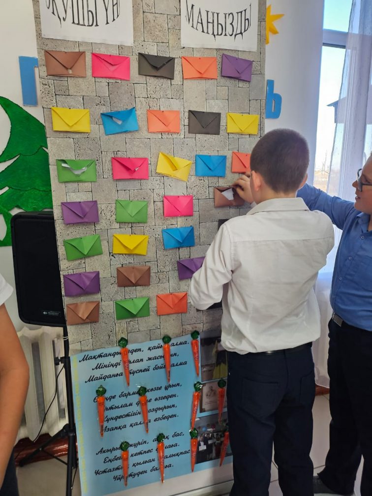 «Оқушы үні маңызды»  түрлі- түсті конверттерге оқушылар үзілісте өздерінің тілектерін  мемлекеттік тілде өз ойларын  жазып   жатқан сәттері.