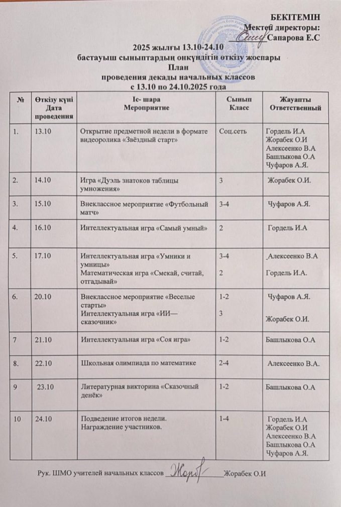 Бастауыш сынып мұғалімдерінің онкүндігіне арналған жоспар